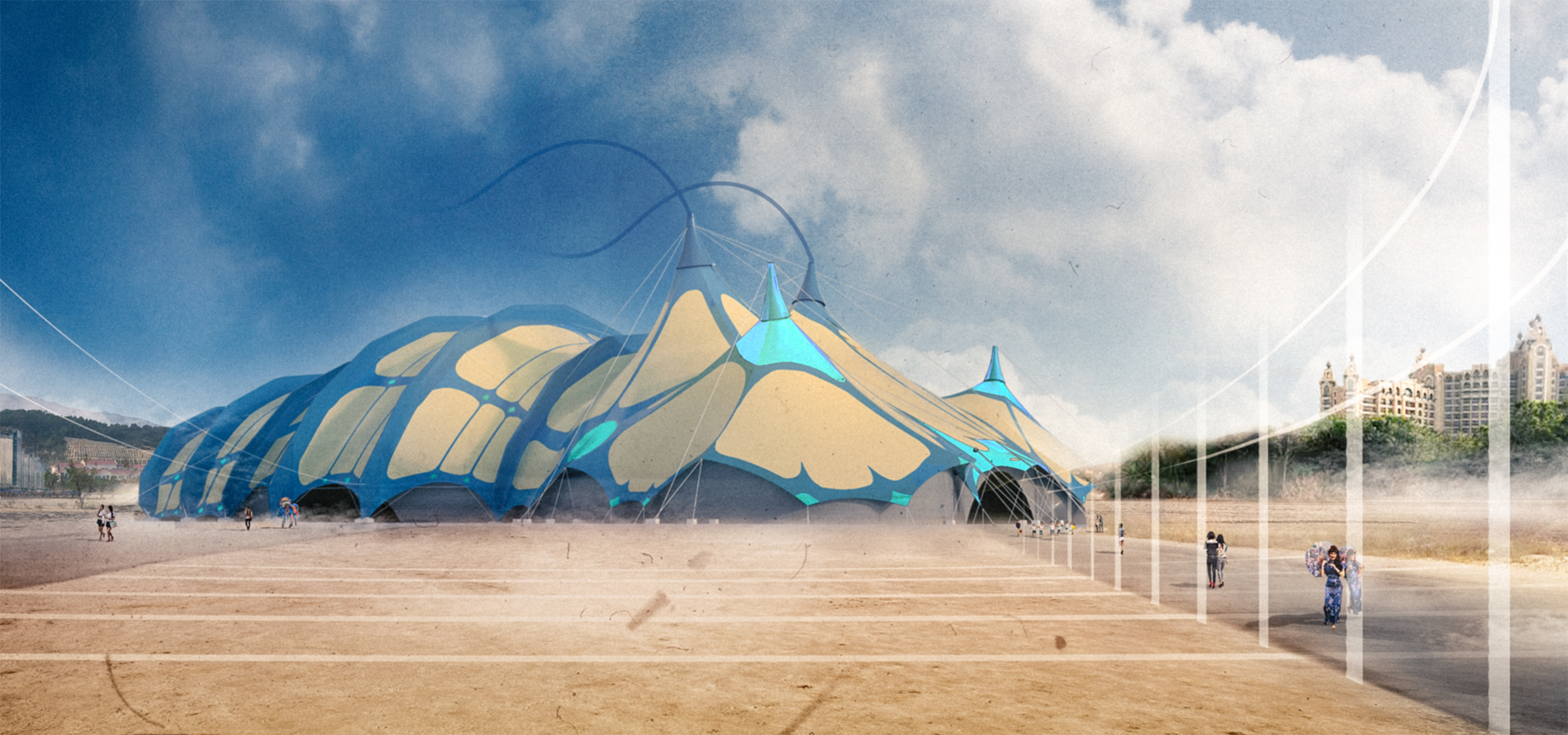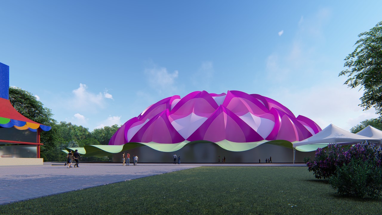 Le bouton de lotus : la structure existante, dôme réticulé de 110m de diamètre extérieur, accueillant des spectacles de cirque à Guangzhou (Chine méridionale) nécessitait un remplacement de la toile. Inspirée par la forme hémisphérique du dôme, notre proposition fait référence au bouton de lotus, l’un des principaux symboles visuels chinois, dans une synergie combinant ingéniosité structurelle, gestion des eaux pluviales, et surtout efficacité visuelle.