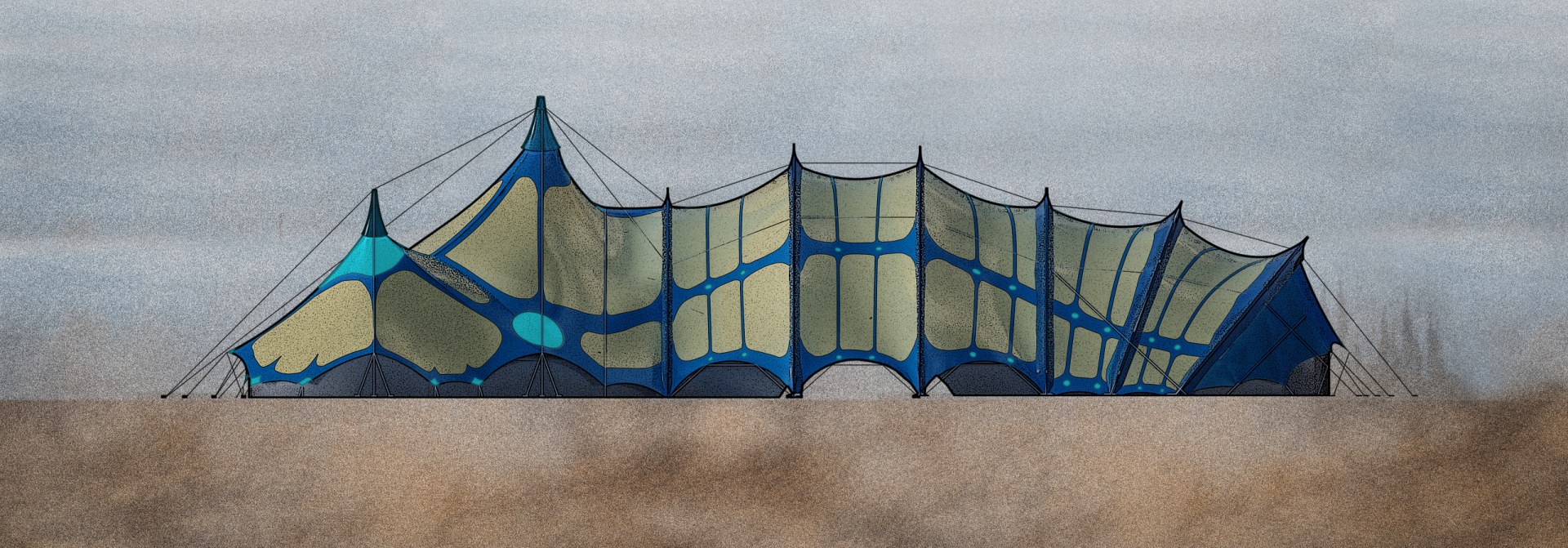 Animaux marins : à partir d’une structure métallo-textile dont le principe d’ingénierie préexistant privilégiait un développement longitudinal, notre proposition fait appel à l’imaginaire des fonds marins. En effet, à l’image des fabuleuses formes de vie, crustacés et autres invertébrés, le chapiteau joue avec les références zoomorphes et les couleurs contrastées des organismes des mers chaudes. Empruntant le design conçu pour le fabricant leader français VSO, un chapiteau a été construit pour une courte durée dans le parc d’attractions.