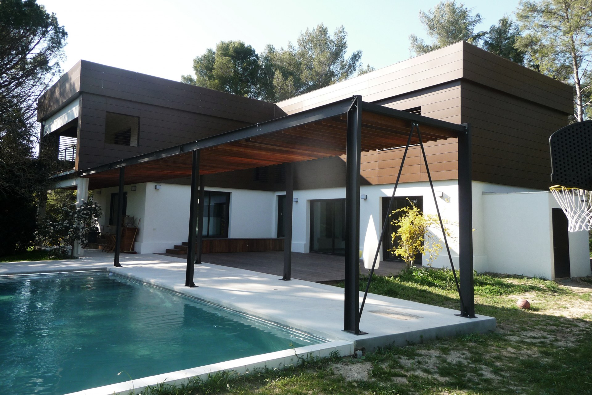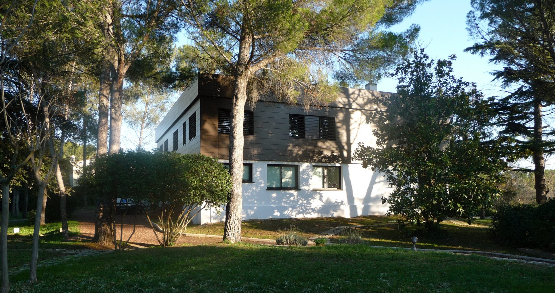 La transformation et réhabilitation de cette maison des années 70-80 suit des stratégies bien définies. La création d’une vraie relation avec un extérieur existant de qualité (pinède et jardin paysagers) se fait par une migration des pièces de vie au rez-de chaussée, qui a été largement ouvert, à la fois à travers des baies sur l’extérieur mais également dans l’aménagement des espaces intérieurs. Des aménagements extérieurs mis en valeur pour une plus grande fluidité.