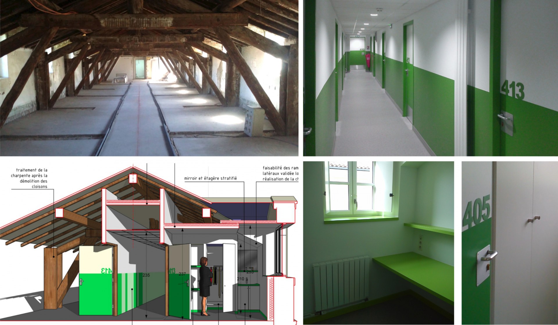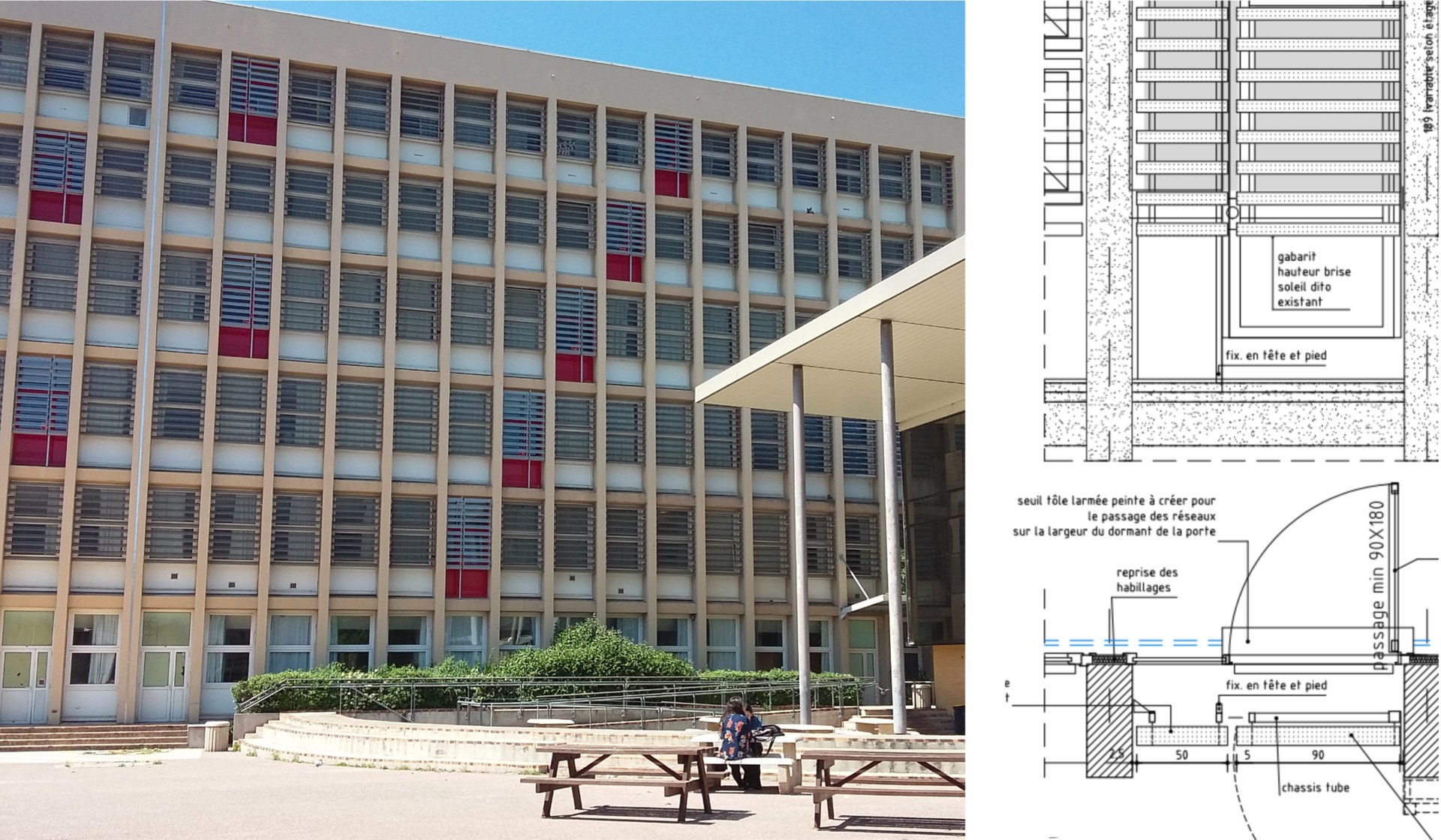Une grande diversité (en taille et en termes de programme) de missions de maîtrise d’œuvre nous a été confiée de 2013 à 2017 dans le cadre du marché à bons de commande concernant des travaux d’urgence, et de mise en sécurité dans les lycées de la Région Languedoc-Roussillon, donnant souvent à des lieu à des restructurations pour changement de destination et /ou réhabilitations.Cette « architecture du quotidien », presque systématiquement en site occupé, se doit d’être précise et attentive au « déjà-là » : bâti, usagers. Notre rôle dans ces opérations, parfois complexes techniquement et réglementairement, est d’avoir une réponse attentive à l’existant bâti et aux usages, de transformer la contrainte réglementaire en un atout pour l’amélioration du cadre bâti.