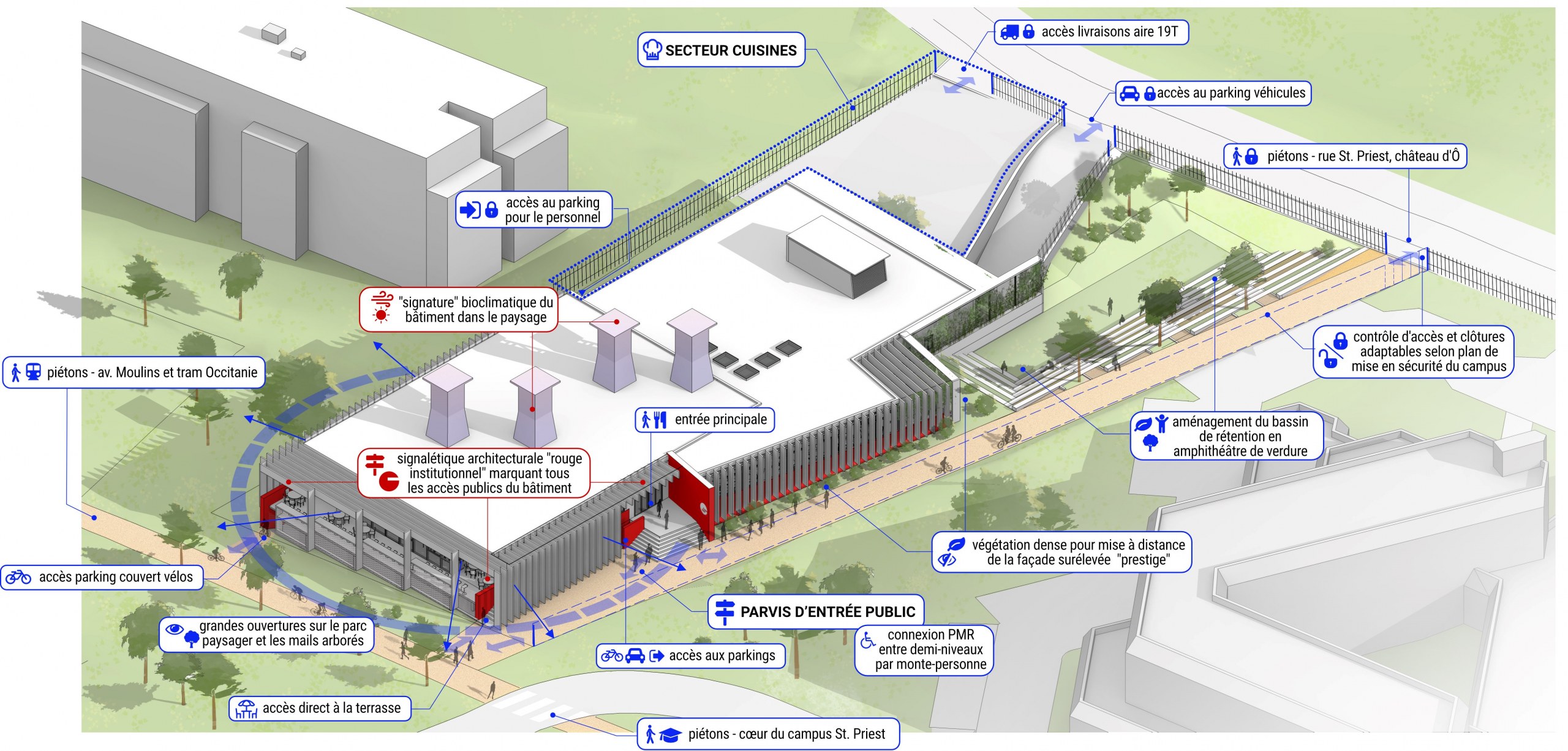Affichant robustesse et économie énergie, le projet s’affirme comme une pièce centrale du Campus Saint-Priest et participe de la nouvelle polarité de cette zone en mutation qui s’inscrit dans l’Opération Campus menée par Montpellier Métropole.